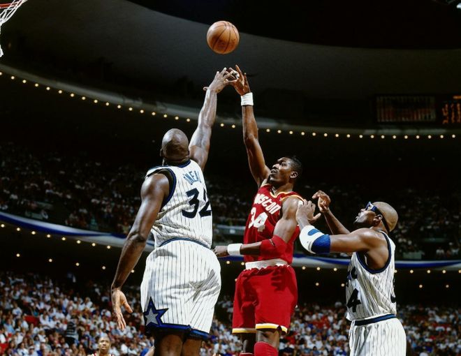 奧拉朱旺是NBA史上被包夾頻率最高的中鋒之一。1995年總決賽對上魔術(shù),遭遇奧尼爾和霍勒斯·格蘭特的雙人包夾,包夾比例高達(dá)71%。