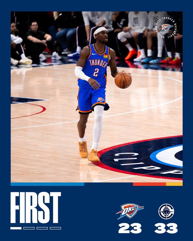 快船隊的哈登上半場得到22分、5個籃板和4次助攻,科林斯得到15分;雷霆隊的亞歷山大得到12分和7次助攻,喬得到11分。